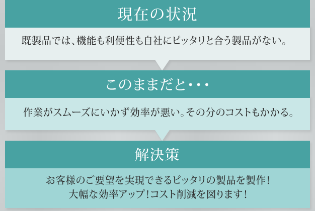 既製の製品は安くて機能的だけど、デザイン的に不満があったり、使いづらかったり。最適な製品を見つけるのは時間がかかります。 機能性と利便性の両立を実現する、オーダーメイド製品を製作しております。